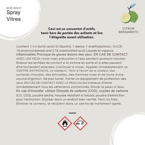 Liste ingrédients réglementation détergence et Ecocert : <5% : agents de surface non ioniques, parfum naturel, Contient aussi : Alcohol, eau, acide lactique, D-Limonene                                  100% des ingrédients sont d’origine naturelle.